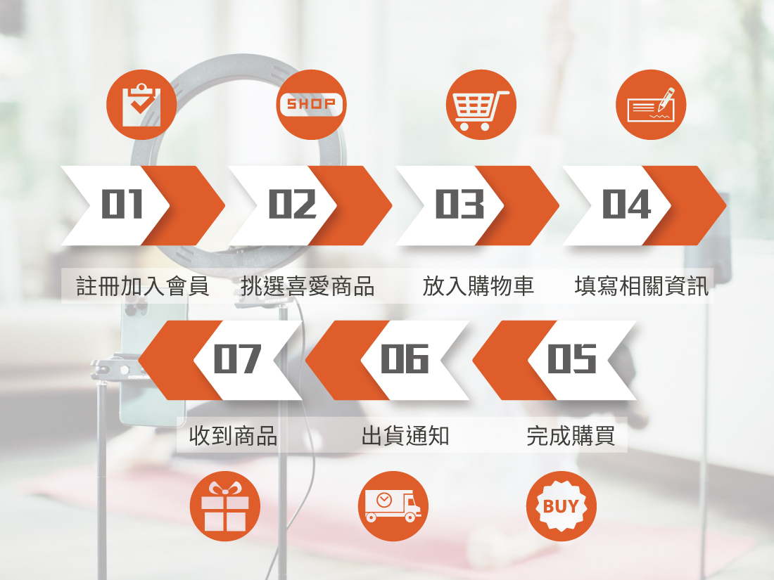 註冊加入會員 → 挑選喜愛商品 → 放入購物車 → 填寫相關資訊 → 完成購物 → 出貨 → 收到商品。
